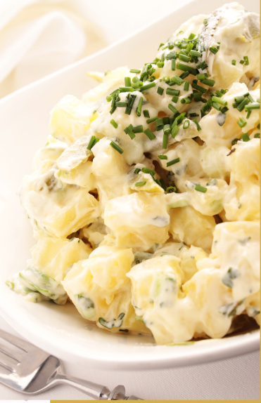 Peel the skins from the potatoes and cut into large diced pieces. Transfer the warm potatoes to a large mixing bowl and sprinkle with the white vinegar and stir. Allow the potatoes to cool, about 15 minutes. Add the celery and green onions. Chop 4 of the hard boiled eggs and add to the potato mixture.